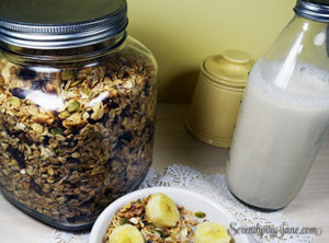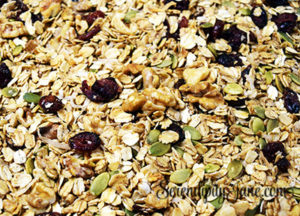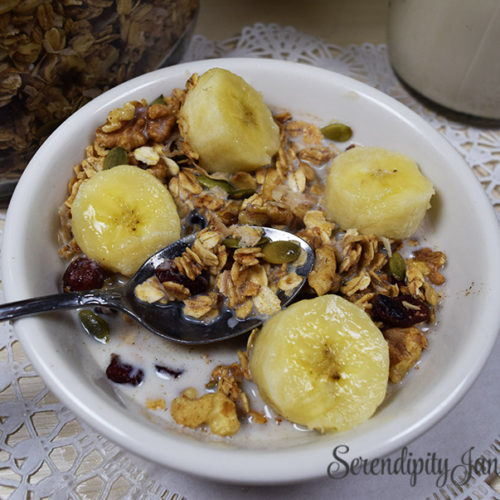 Breakfast cereal was one of my first targets.  I found a recipe on the internet for homemade granola and after a few tweaks, began making homemade granola on a regular basis. My son was a teenager at the time, and while he complained about my laundry soap concoction that had to be shaken before each use because it would separate, the homemade granola was an enormous hit. It wasn’t unusual to find a couple of Andrew’s friends sprawled on the furniture eating granola and scraping the bottom of their bowl to get every last bit of goodness.  Cranberry Walnut Granola has been transformed into an even healthier version over the years  and  is now gluten free and vegan.