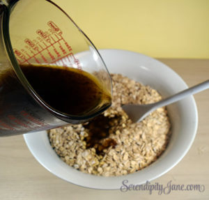 • Pour the Oats into a large bowl.  I use the entire package of the Bob’s Red Mill Gluten Free Organic Oats. It may be a little over the eight cups but this recipe is forgiving.  Set the oats aside.