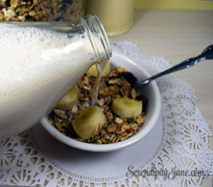 I like to have it in a bowl with  little almond milk, and sliced bananas, but it is also good sprinkled on vegan vanilla yogurt. If you want a quick dessert, you can sprinkle sliced fruit with a little sweetener, add a layer of the granola and microwave until the fruit is soft. Top it with a non dairy topping and you have a satisfying treat that is the next best thing to a fruit crisp!