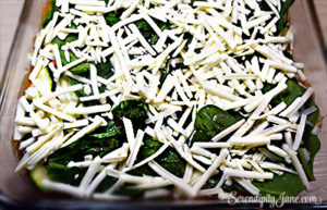 • Repeat the process! by adding a layer of noodles, then ricotta mixture, then mozzarella shreds, then zucchini, then spinach, then sauce.