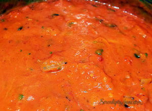 • In a 9 x 13 baking pan (or divide the ingredients between two 8 x 8 baking pans), place one cup of the sauce in the bottom of the pan(s)  and distribute evenly. this will keep the lasagna from sticking to the pan.  No need to grease the pan.