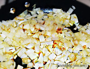 • Chop one to two large onions, so that you have two cups and add to the frying pan over medium heat.