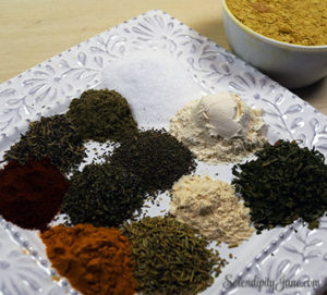 , Salt, onion powder, parsley flakes, sage, celery seed, garlic powder, thyme, marjoram, rosemary, smoked paprika and turmeric. I know it seems like a lot but this goes really quick. Unless you have celiac disease, and if cross contamination is a problem, I suggest you buy the spices in the bulk department of your supermarket. Sprouts and Whole foods have excellent bulk spice areas where you can purchase just what you need. No need to buy a four dollar bottle of marjoram, when you can purchase just a teaspoon for just a few cents! If bulk bins aren’t an option, purchase the bottled version. Just make sure you are purchasing spices marked as organic and non-GMO.